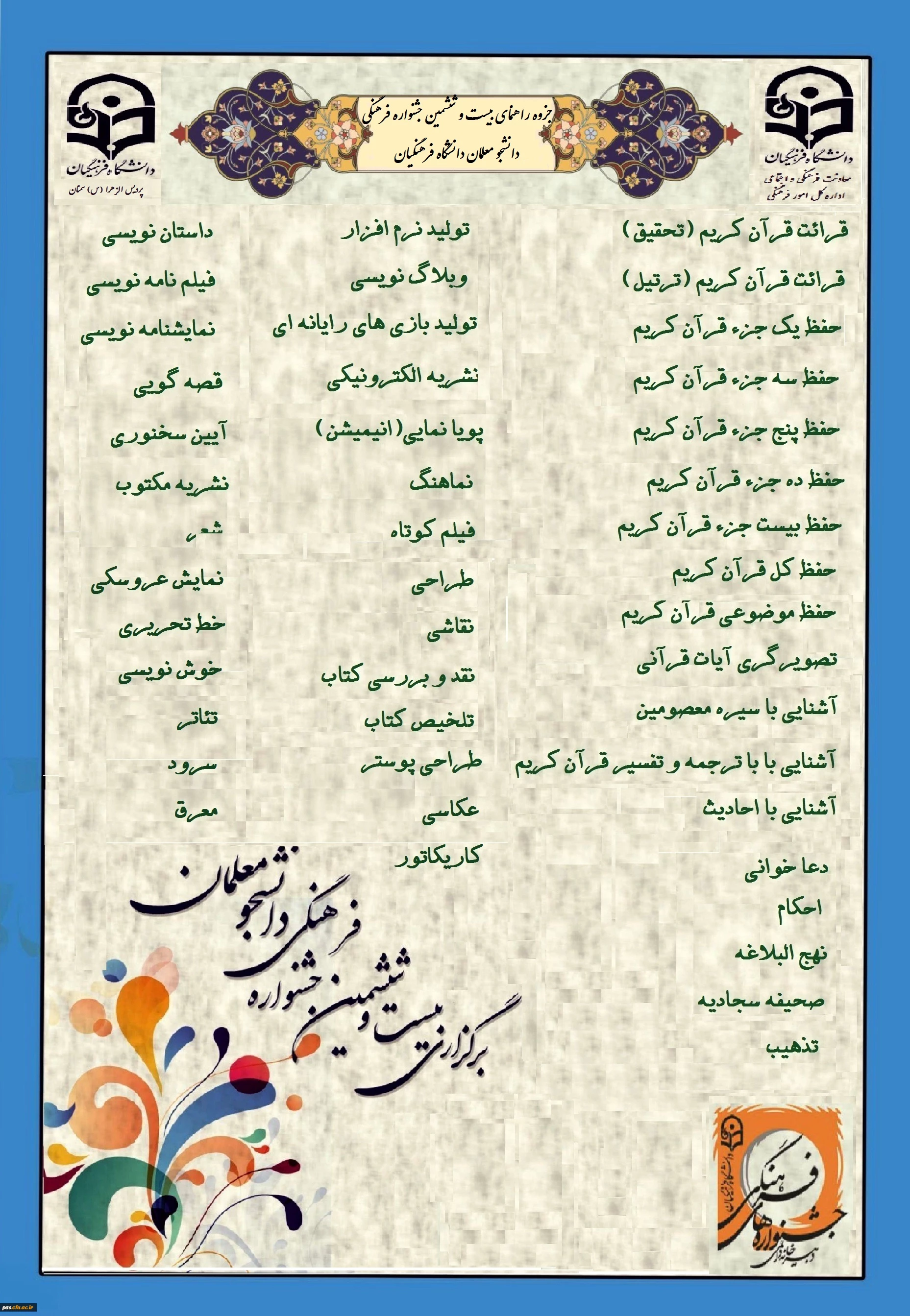 امتیاز دهید : راهنمای بیست و ششمین جشنواره فرهنگی دانشجومعلمان دانشگاه فرهنگیان یکشنبه 29 آذر 1394 ساعت 9:36